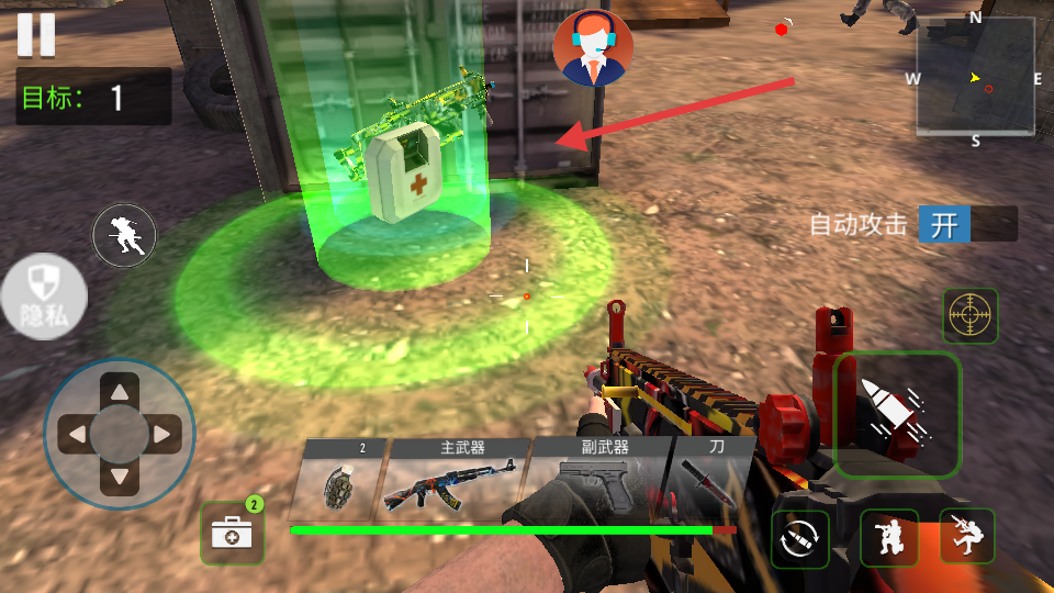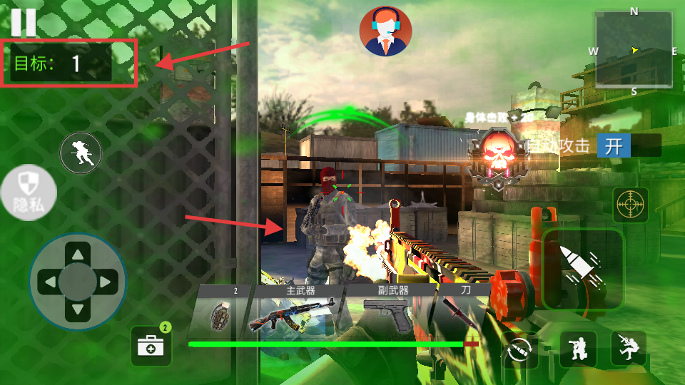 3、关注【目标:1】提示,开启【自动攻击】,用左侧摇杆移动,配合武器射击消灭敌人。