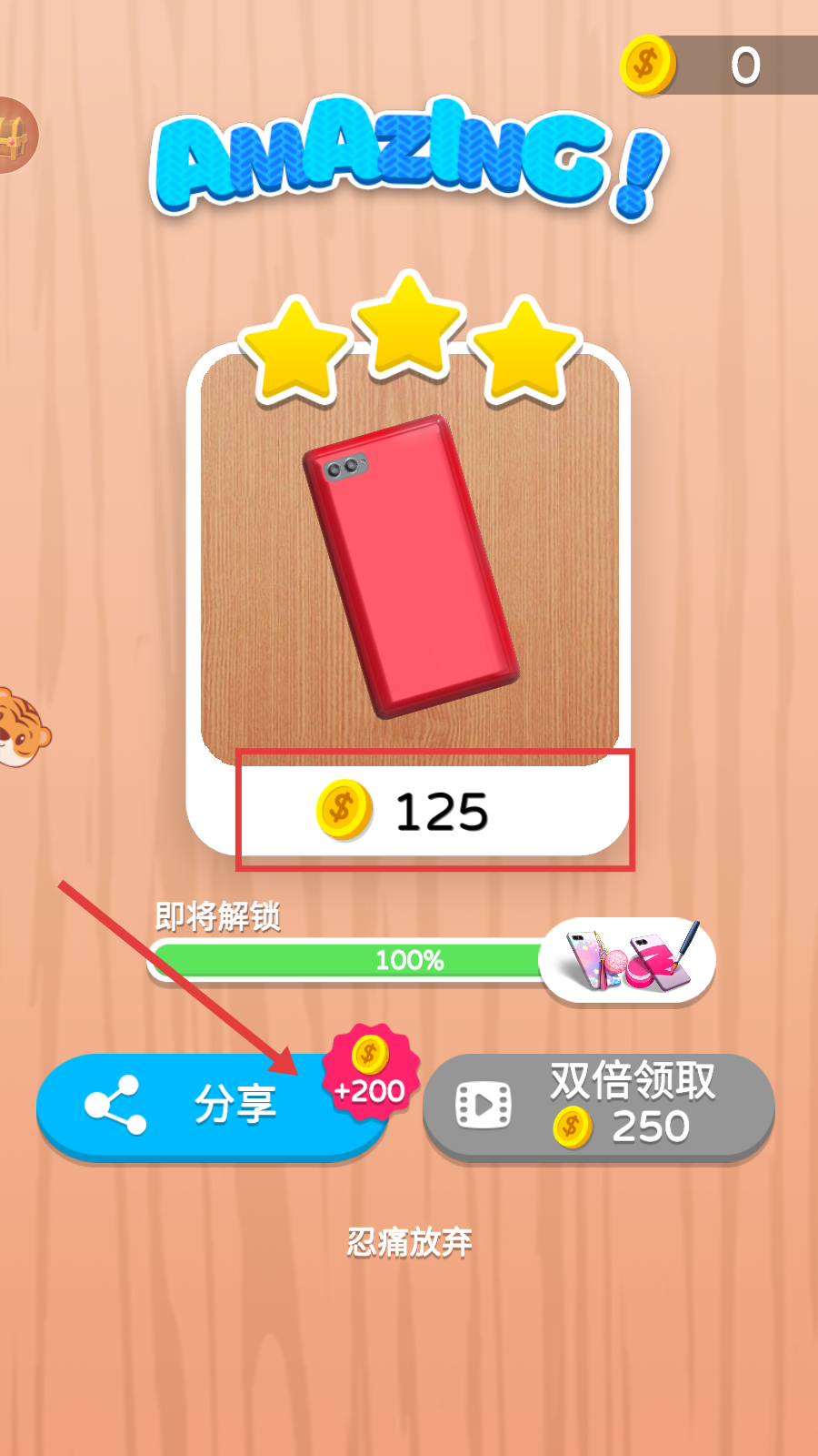 4、完成手机喷涂烘干后,可获得金币奖励,还能选择分享等操作。