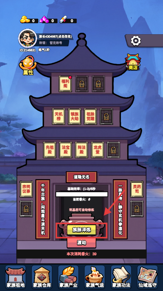 2、在家族祖地点击【族脉淬炼】,消耗香火强化血脉,助力后代能力成长。