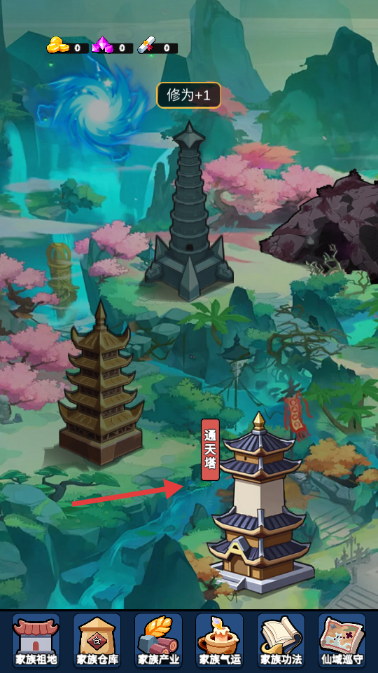 3、探索场景中的【通天塔】,进入后可参与挑战,获取修为-灵气等发展资源。
