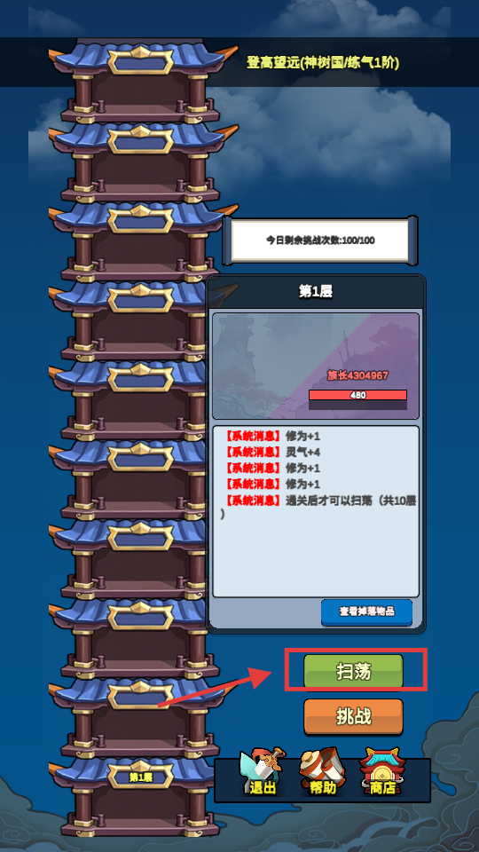 4、通关通天塔层数后,点击【扫荡】按钮,快速获取修为-灵气等奖励,提升效率。