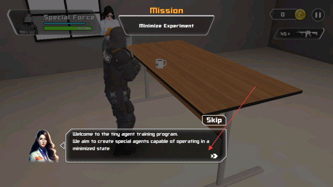2、查看任务【MinimizeExperiment】相关说明,可点击【Skip】跳过对话,快速进入实验环节。