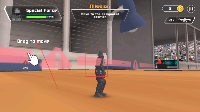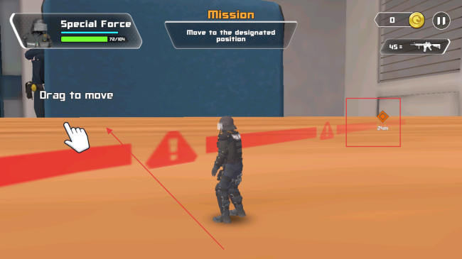 3、依据【Drag-to-move】操作方式,操控角色向带有橙色标记的指定位置移动,注意避开红色警示区域。