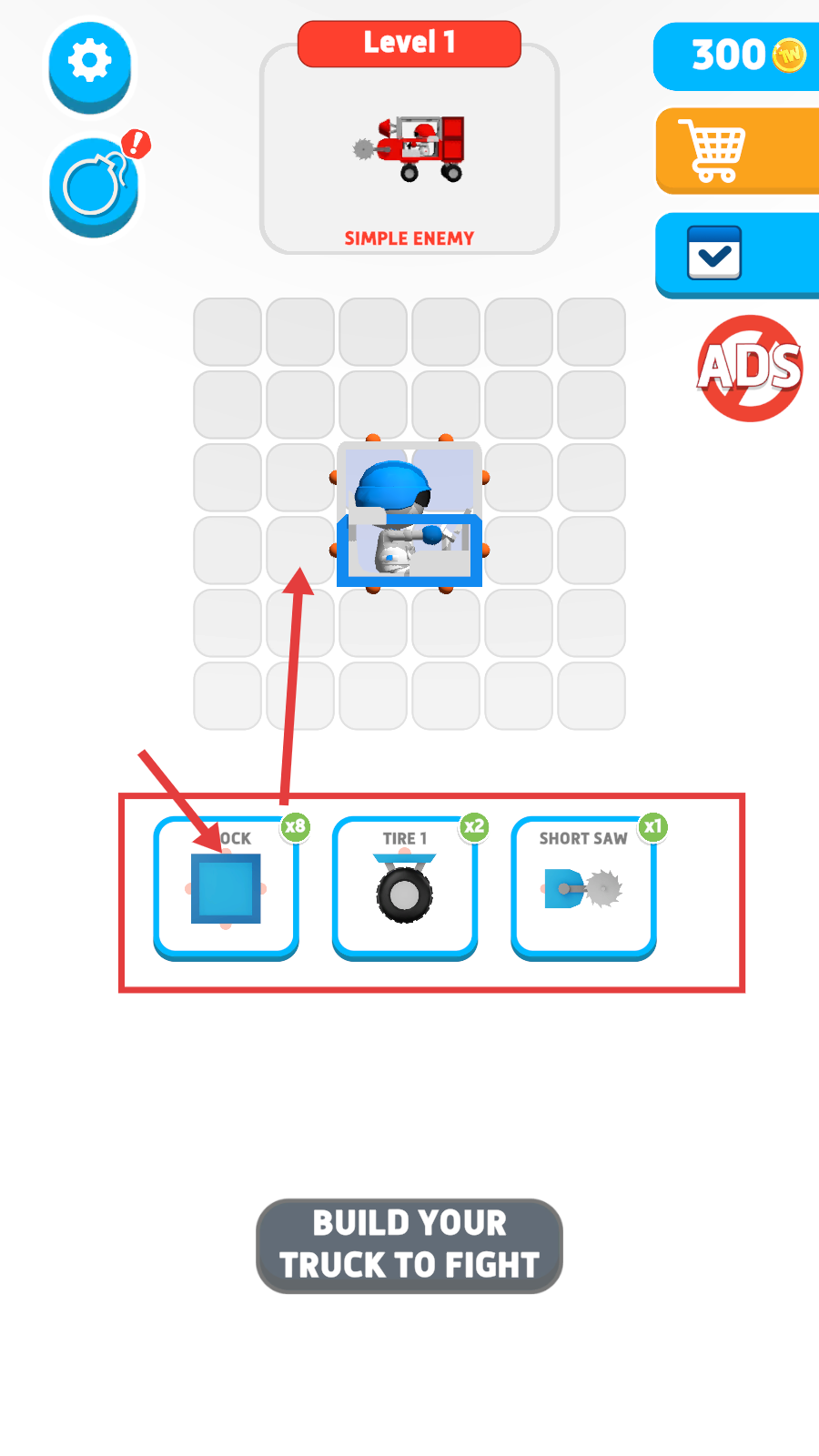 1、选择方块、轮胎、短锯等部件,组装战斗卡车。