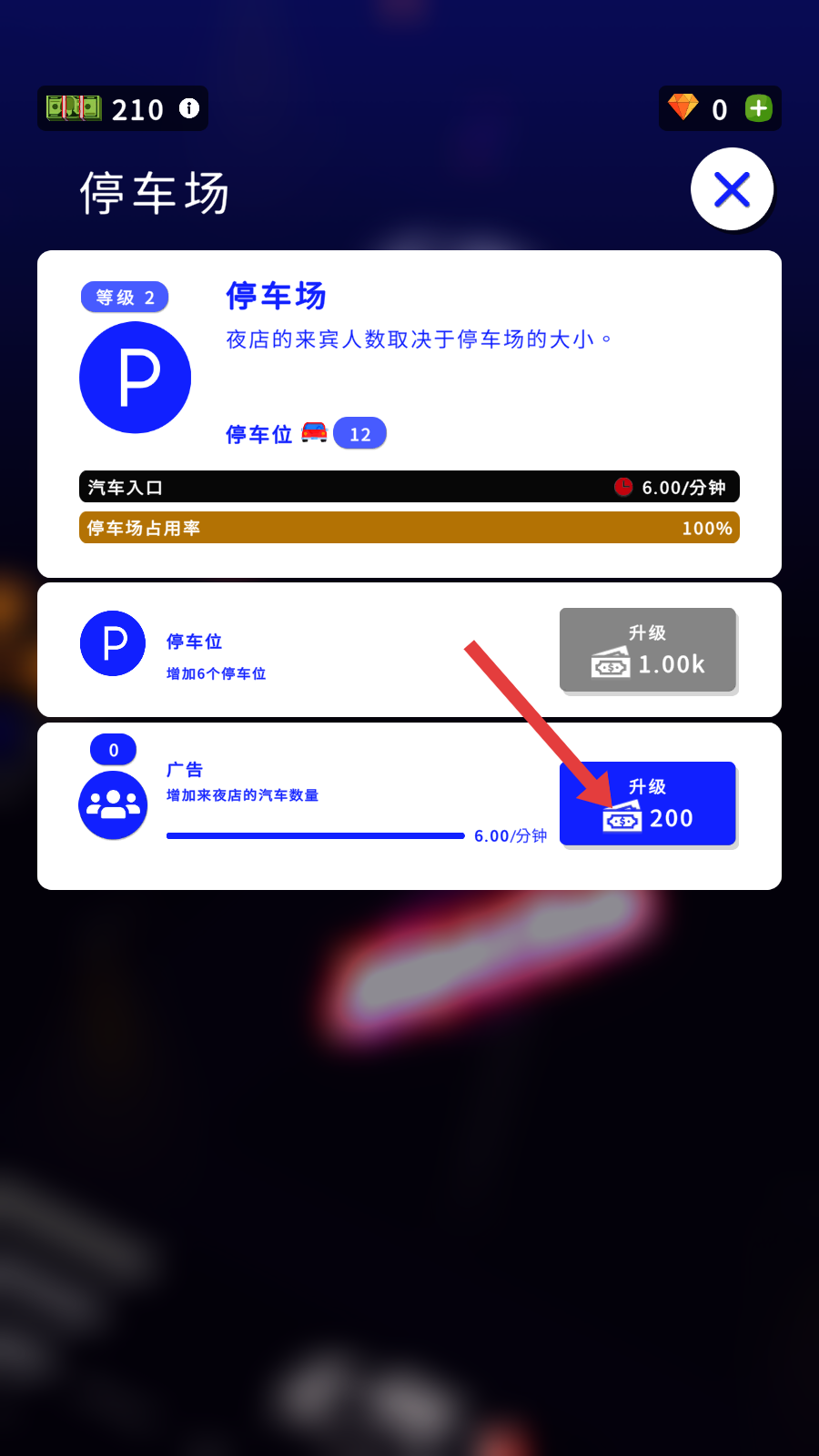 2、点击【升级】按钮,花费200货币升级广告,增加来夜店的汽车数量。