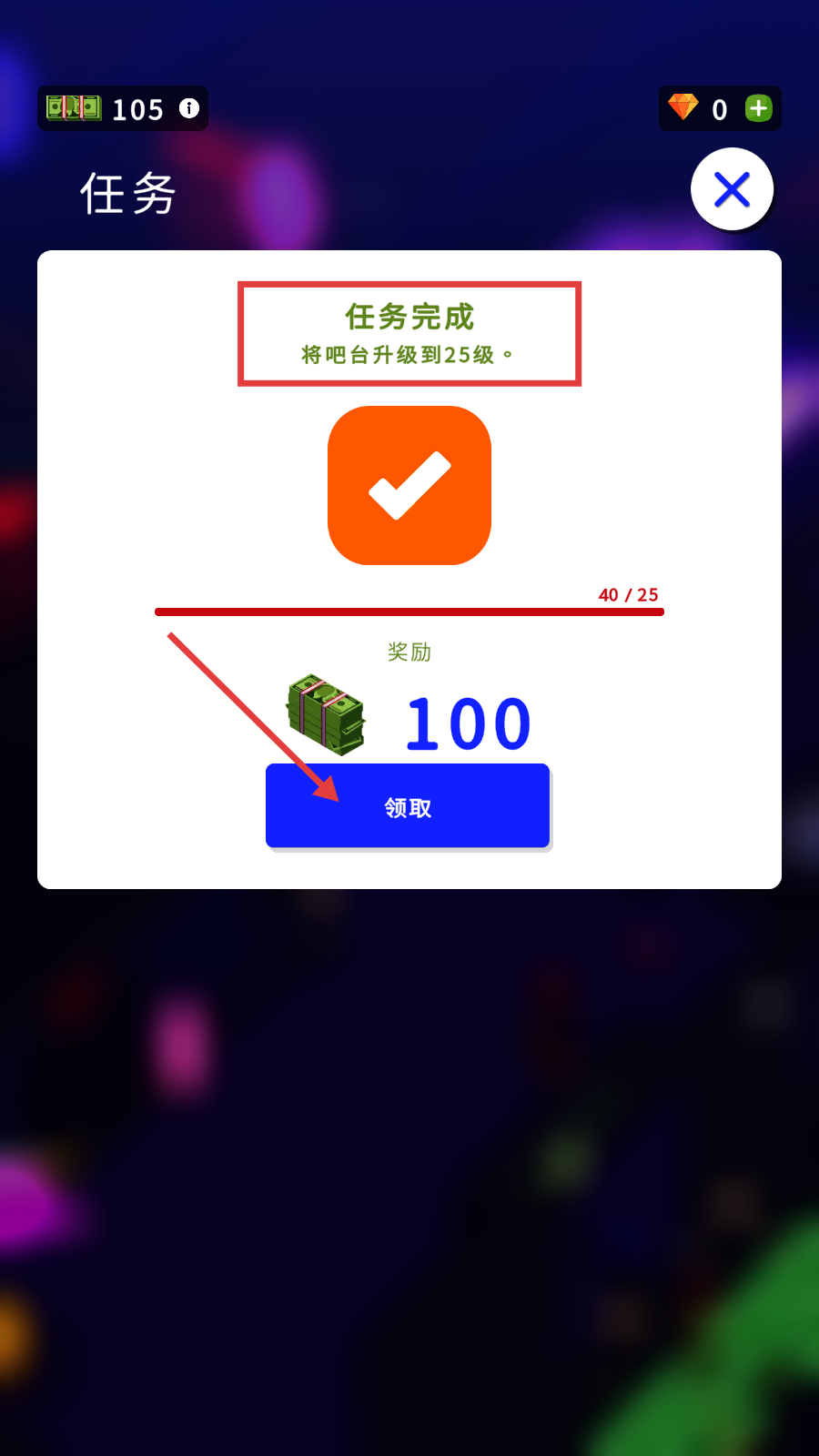 4、完成将吧台升级到25级的任务后,点击【领取】,获取100货币奖励。
