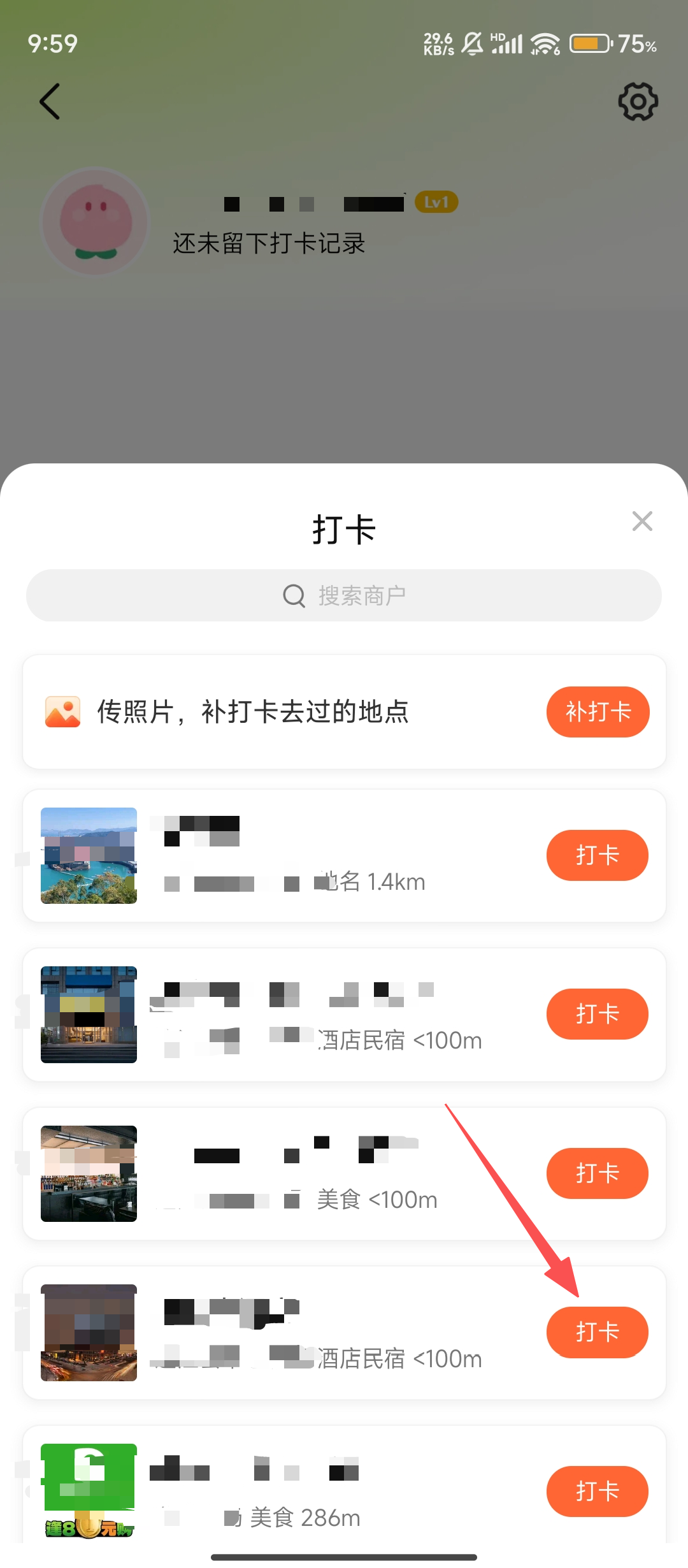 3、在打卡选择页,我们可以搜索商户,也能直接点击商户右侧的【打卡】按钮,挑选要打卡的地点呢。