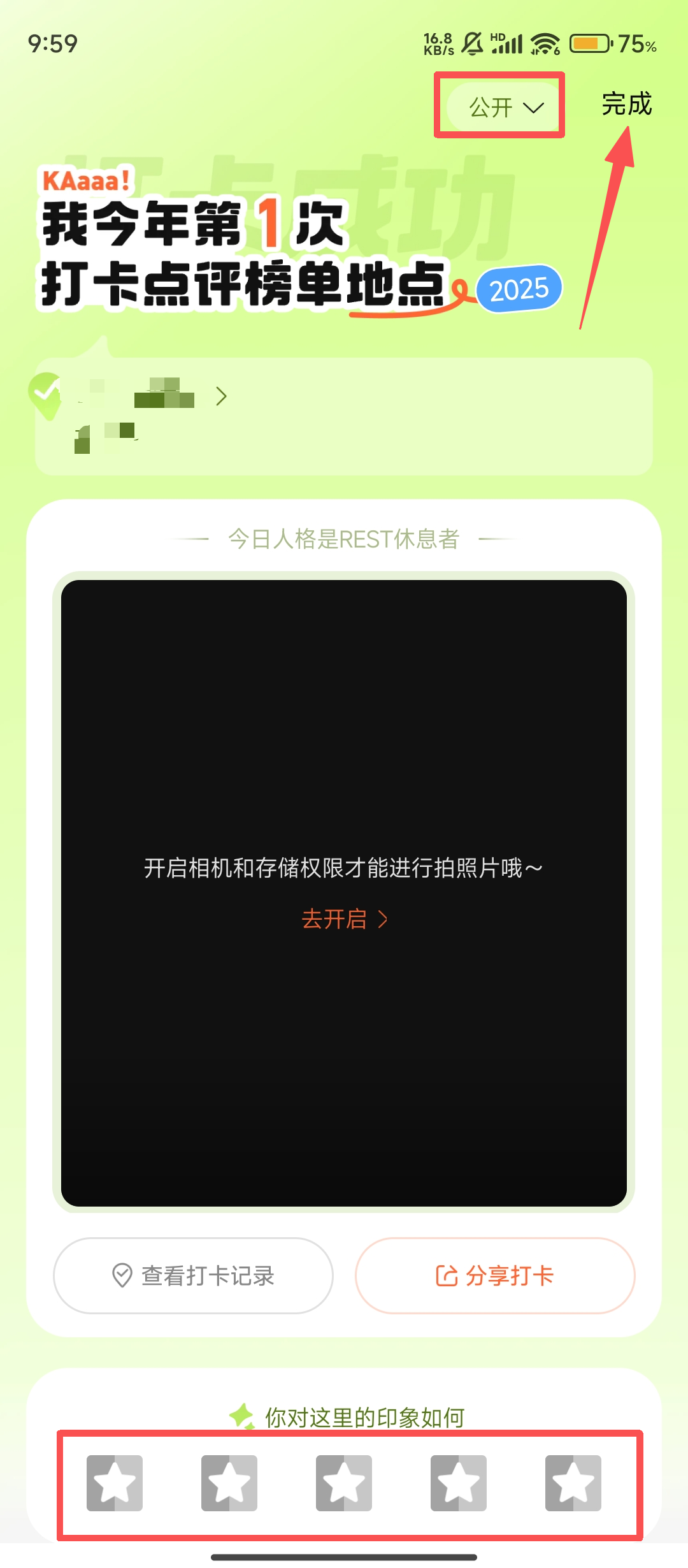 4、打卡后,我们可以设置内容的公开范围,给打卡地点评星,最后点击【完成】,就成功记录这次打卡啦。
