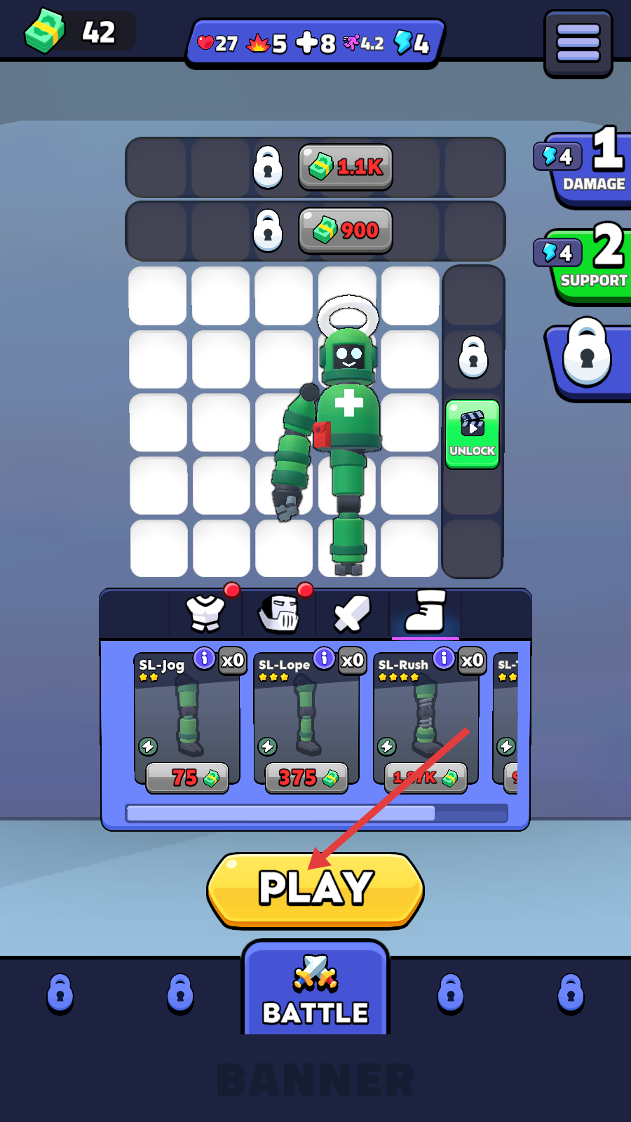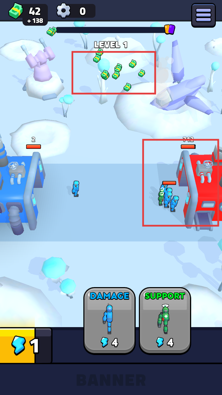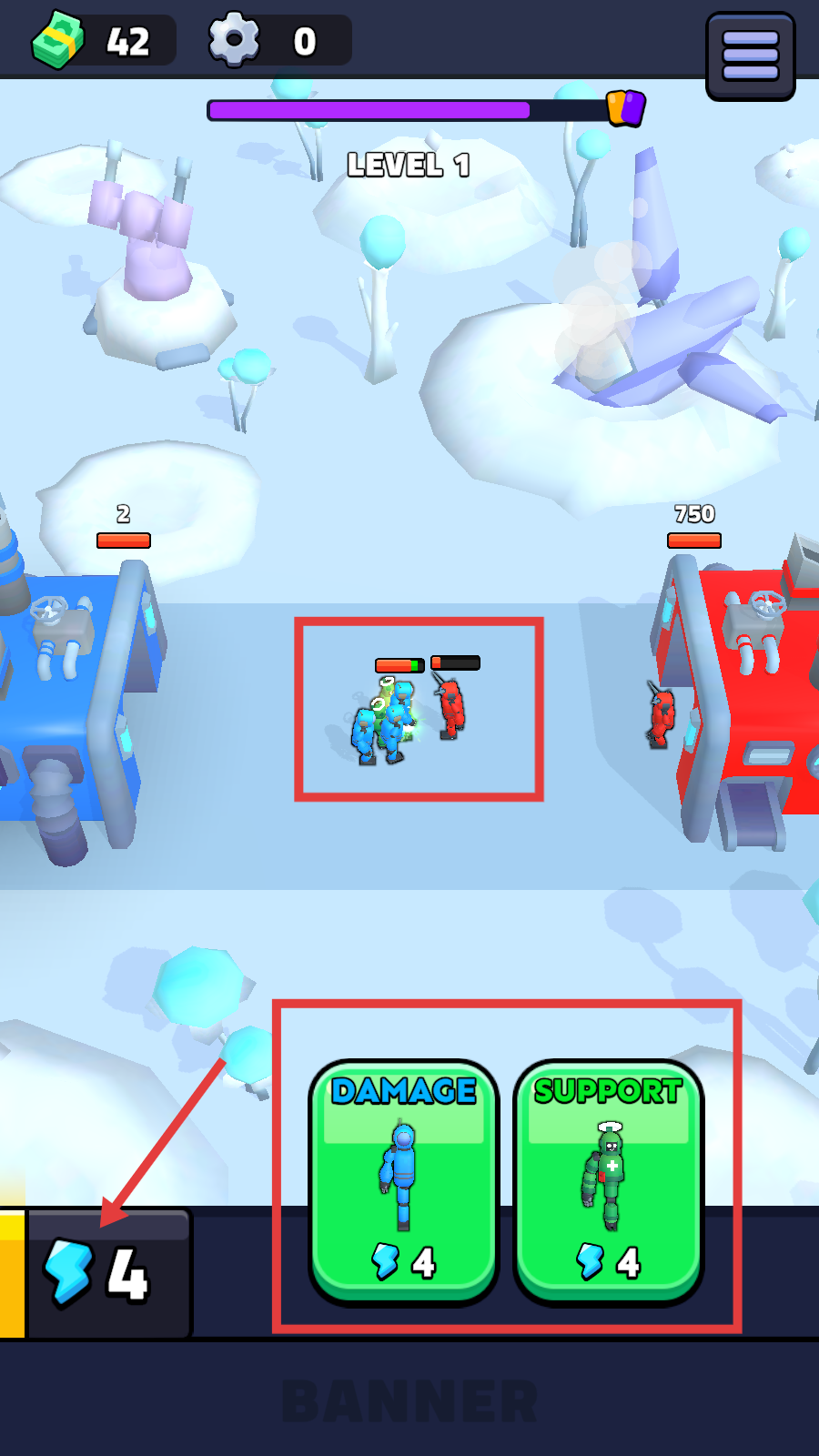 2、使用【DAMAGE】和【SUPPORT】士兵,进行战斗。