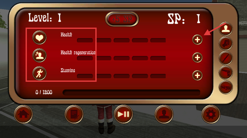 2、升级优先点【Health】、【Health-regeneration】、【Stamina】加号,强化生命、回复、耐力,提升生存力。