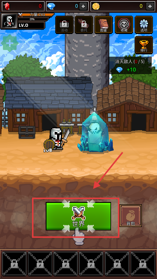 1、点击【世界】按钮开启地牢冒险,操控勇士深入关卡,击败敌人获经验与资源。