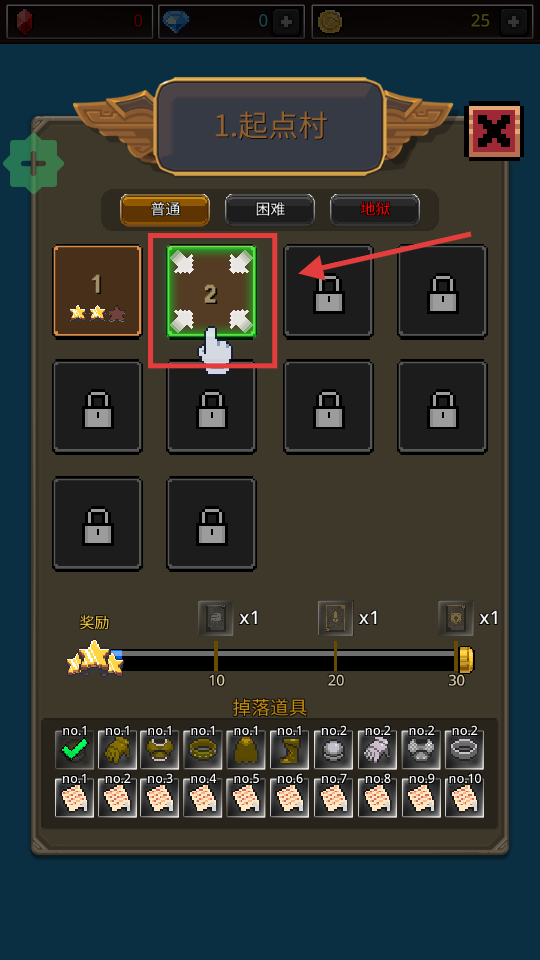 1、完成【1】关后,点击【2】关卡进入,可获对应奖励,推进地牢冒险。