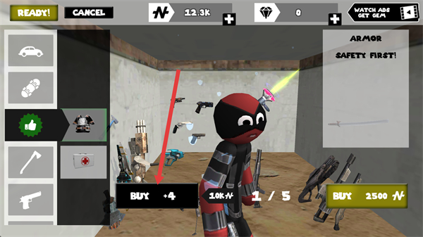 4、获取护甲后,找到界面中的购买按钮,点击该按钮补充道具完成任务准备流程。