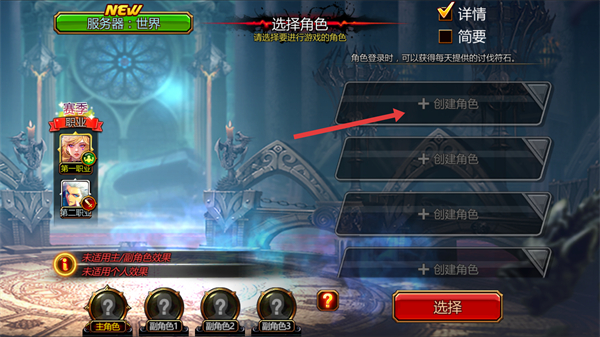 1、在【选择角色】界面,点击【+创建角色】新建角色,选已有角色后点【选择】进入游戏,每日登录可领【钻石】奖励。