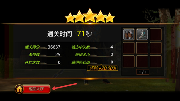 4、查看通关战绩,如【通关时间-71秒】【杀怪数-25】,点击【返回大厅】进入主界面,继续挑战新关卡升等级。