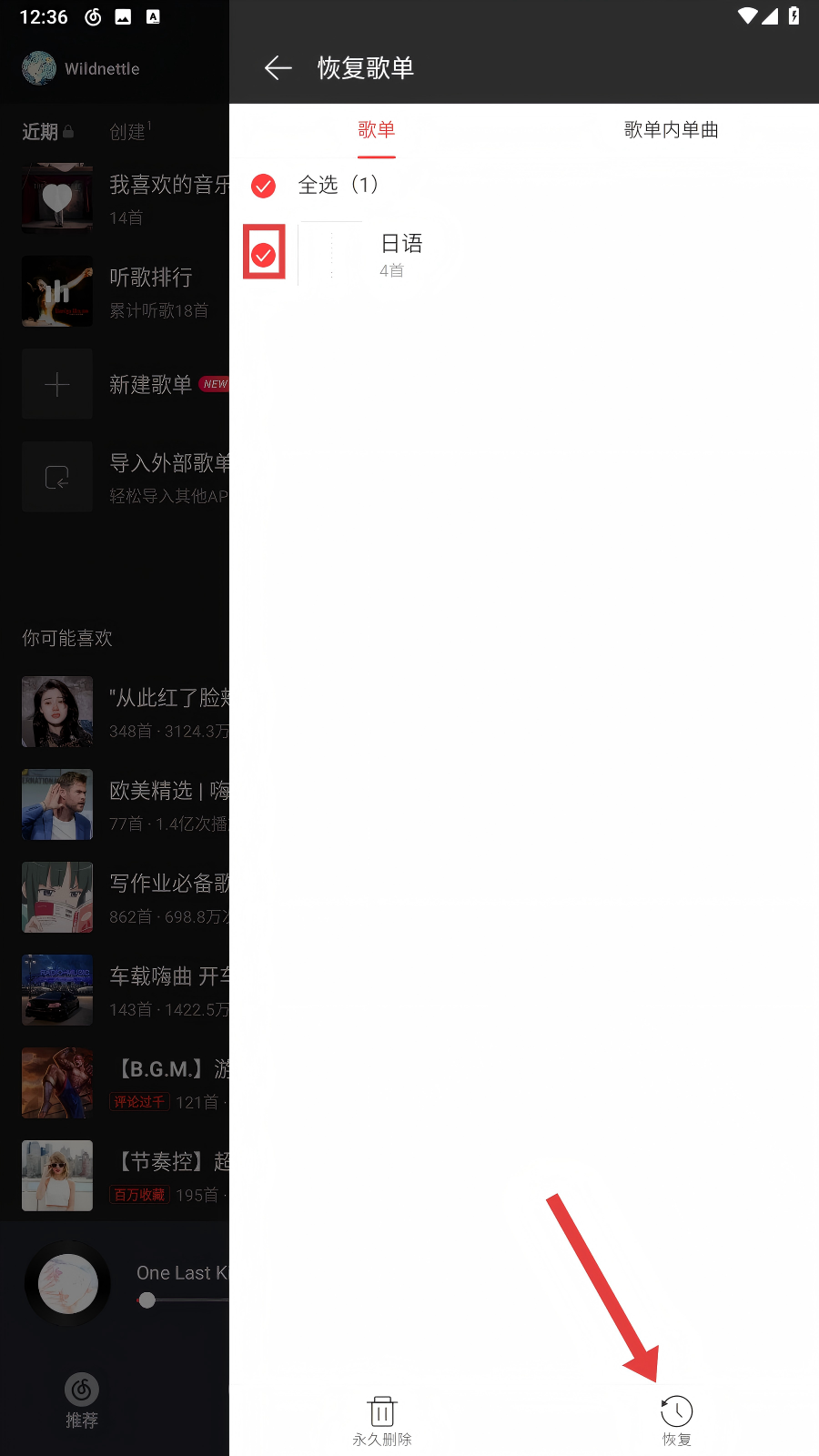 4、在【恢复歌单】页面,选中想要恢复的歌单,然后点击页面底部的【恢复】按钮,就能把歌单找回来啦。