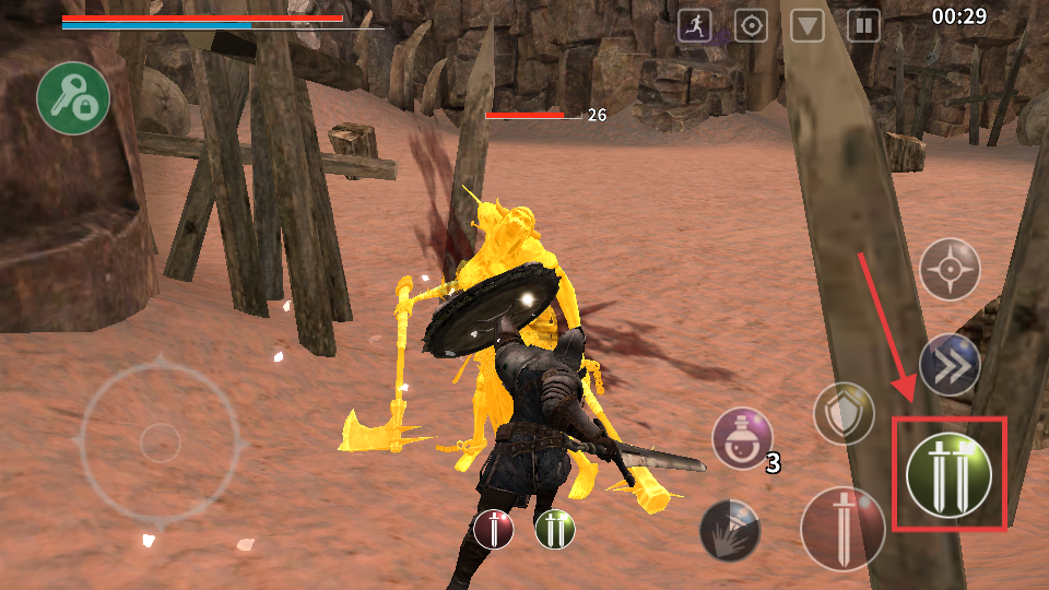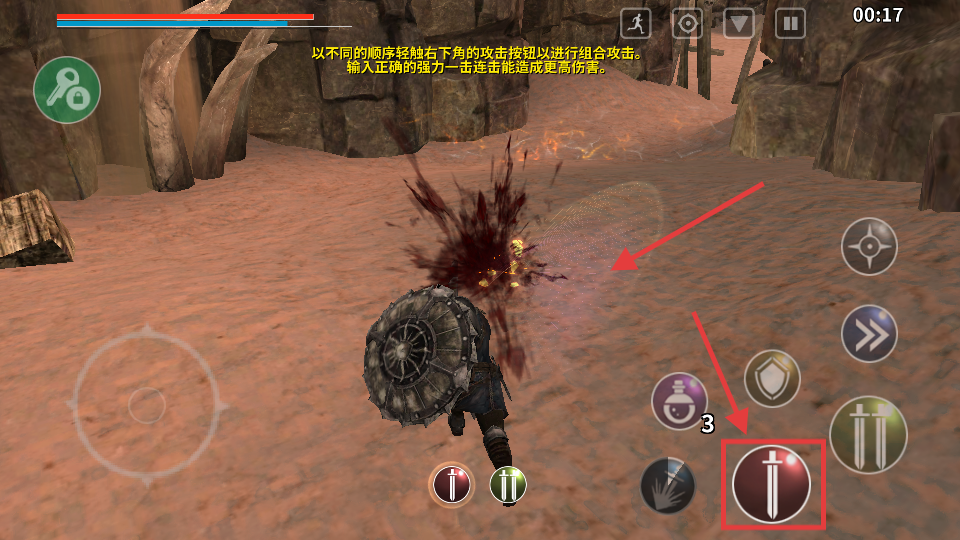 2、战斗时按右下角【剑】形攻击键,按教程顺序组合攻击,能打出高伤害并触发华丽特效。