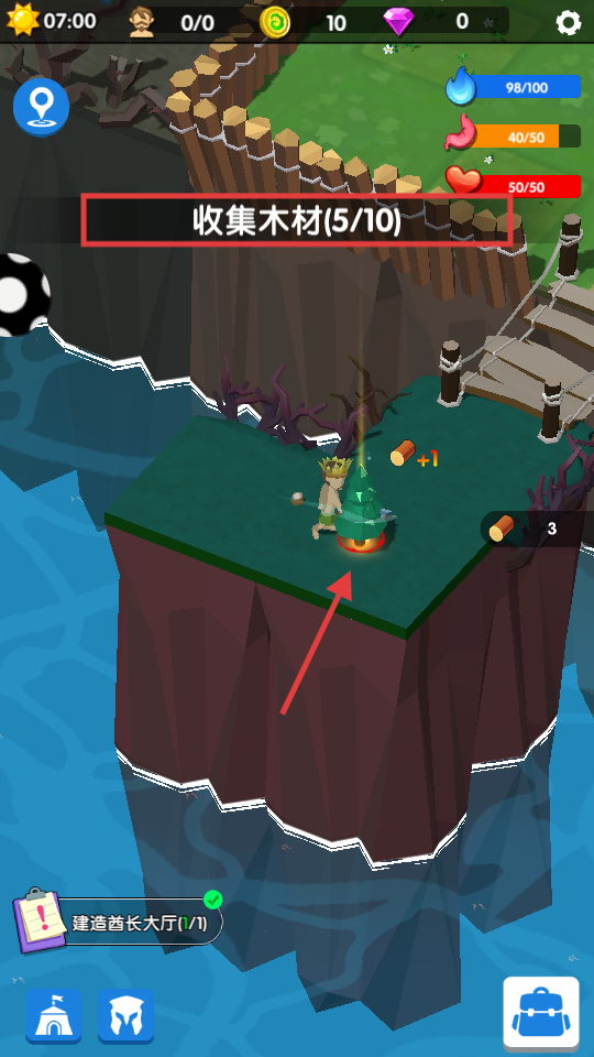 2、根据【收集木材(5/10)】任务,靠近资源点,收集木材推进建造酋长大厅的进度。
