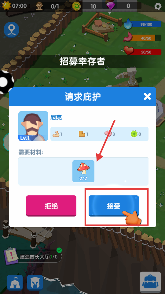 3、招募幸存者【尼克】,所需材料【蘑菇(2/2)】已满足,点击【接受】按钮招募队员。
