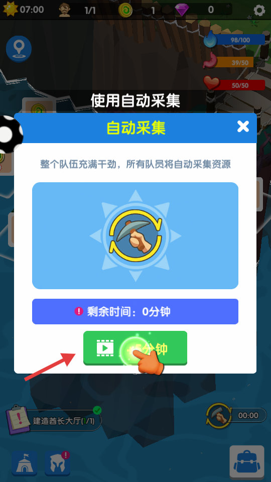 4、使用自动采集功能,点击绿色看广告按钮,可获取额外采集时间,提升资源获取效率。