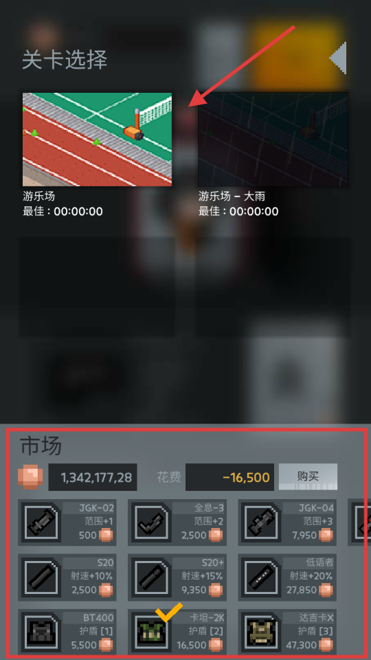 2、选【游乐场】关卡,市场购【卡坦-2K】护甲或武器,用资源强化战力备战。