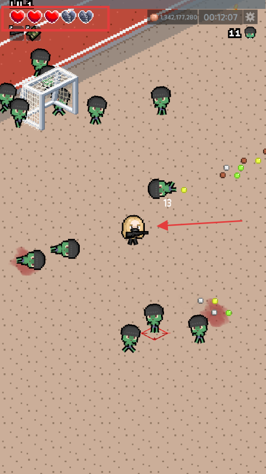 3、操控角色移动躲僵尸,射击输出,关注左上角【爱心】生命值,优先清近身僵尸。