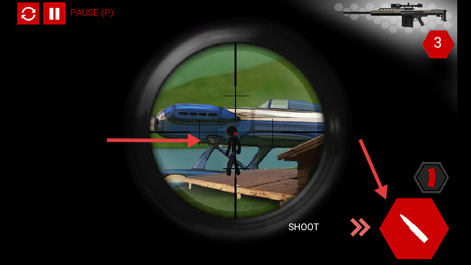 2、瞄准镜对准目标火柴人,确认位置后点击右下角红色射击按钮,精准命中完成击杀。