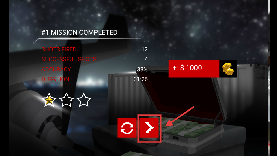 4、任务完成后点击红色向右箭头按钮,进入下一关,同时获取【$1000】奖励提升实力。