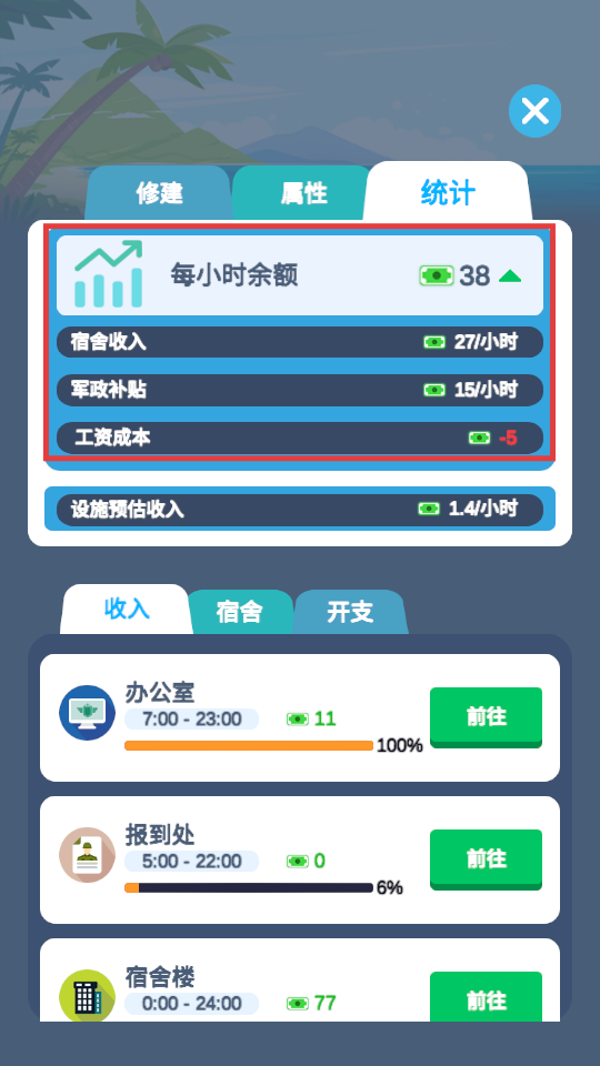 4、查看【统计】界面的每小时余额,分析【宿舍收入】-【军政补贴】-【工资成本】,优化收支提升基地收益。