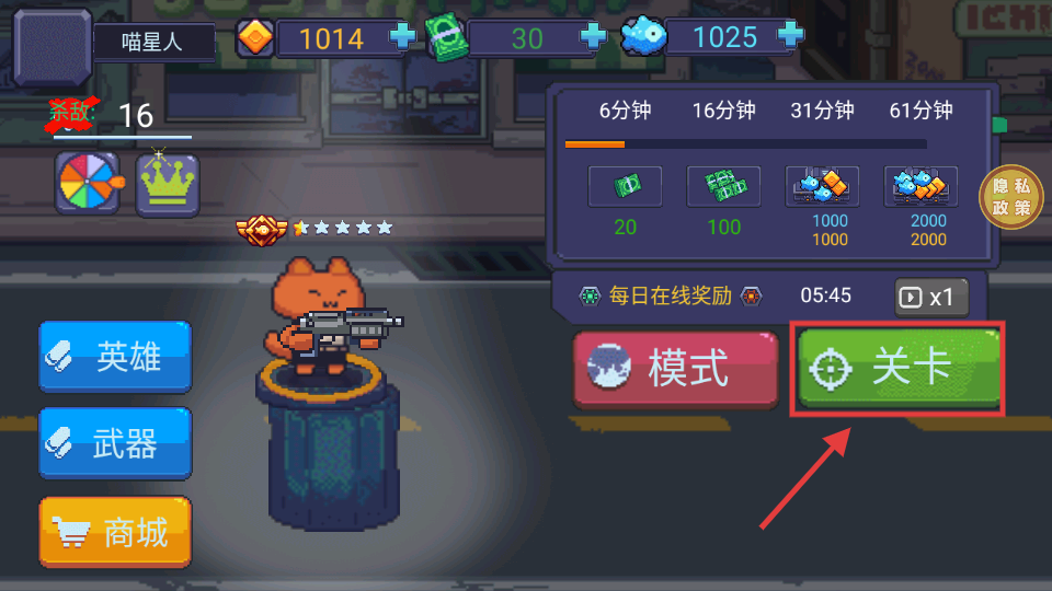 1、点击【关卡】按钮进入射击挑战关卡,完成打靶或战斗任务,积累分数与资源,助力武器升级。