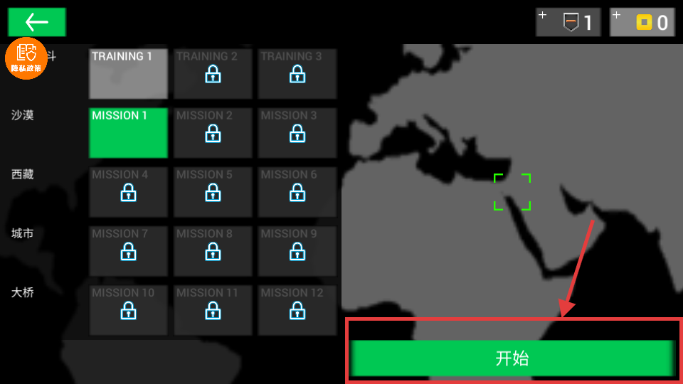 1、在任务界面选择可用的【MISSION-1】,点击下方【开始】按钮,即可进入对应战斗场景开启任务。