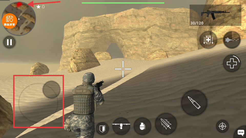 2、左侧摇杆控制角色移动,观察左上角小地图【红点】判断敌人方位,提前规划行进路线躲避或突袭。