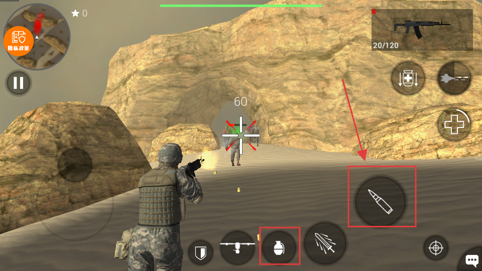 3、遭遇敌人时点击右侧【子弹】图标射击,敌人密集时点击下方【炸弹】图标释放技能,高效清敌并注意弹药。