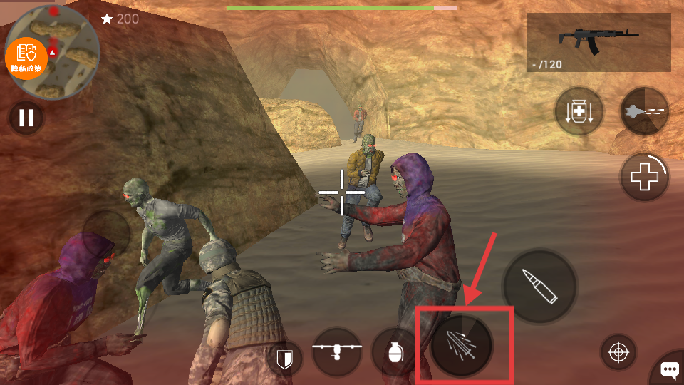 4、面对大量僵尸(如群攻)时,点击下方【火箭弹】图标,利用大范围伤害快速清理敌人,保障自身生存。