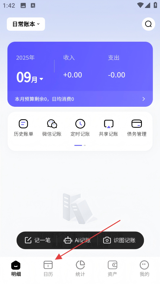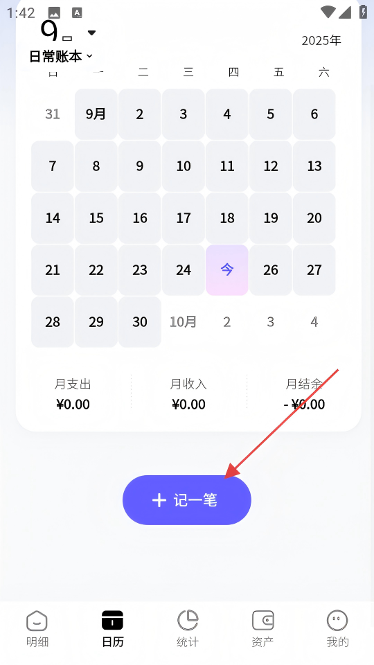 1、点击底部【日历】,进入日历页面,可查看月度日期及收支统计。
