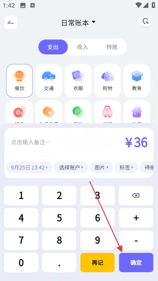 3、在记账页面选择支出类型、输入金额等信息后,点击【确定】。