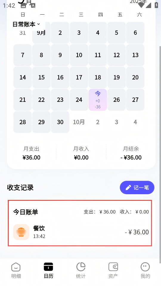 4、完成后,可在日历页面看到“今日账单”中的收支记录,以及月度收支统计更新。