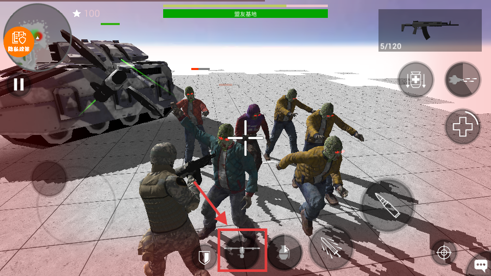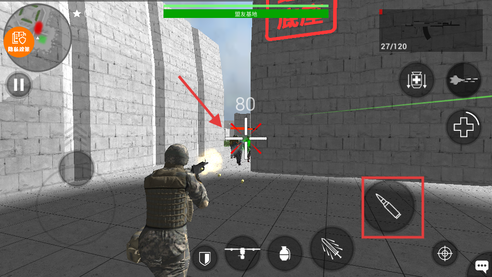 1、瞄准敌人后点击【子弹】按钮射击,注意弹药【27/120】,持续输出消灭目标。