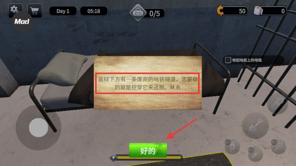 1、在监狱区域内不断探查,寻找容易开凿的薄弱区域,为后续挖掘逃脱通道做准备。