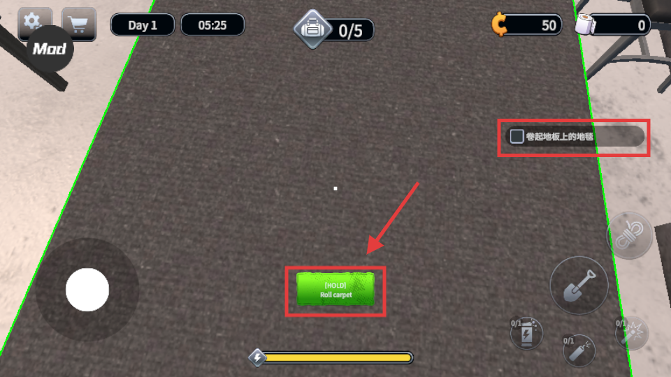 3、长按按钮卷起地板上的地毯为挖掘做准备。
