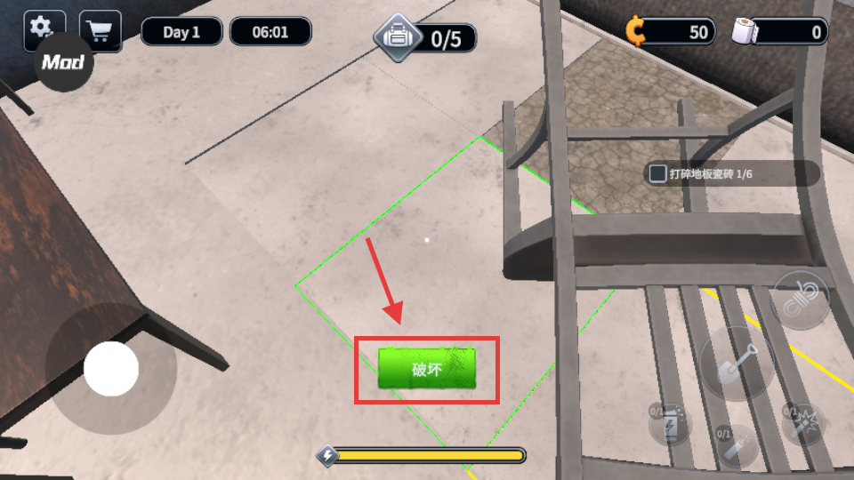4、点击破坏按钮打破地板瓷砖开始挖掘隧道。