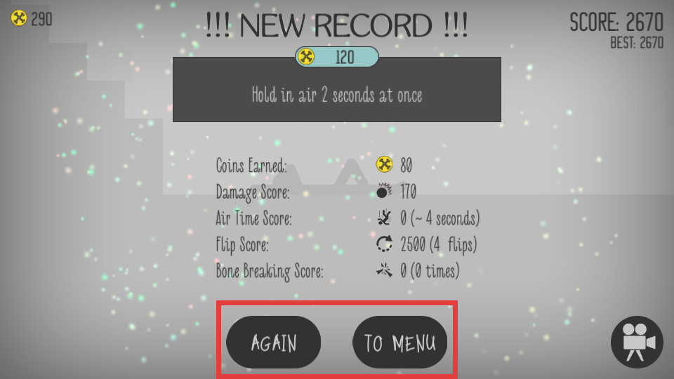 4、游戏结束后,查看【SCORE】得分等信息,若想再次挑战点击【AGAIN】按钮,若返回主菜单则点击【TO-MENU】按钮。