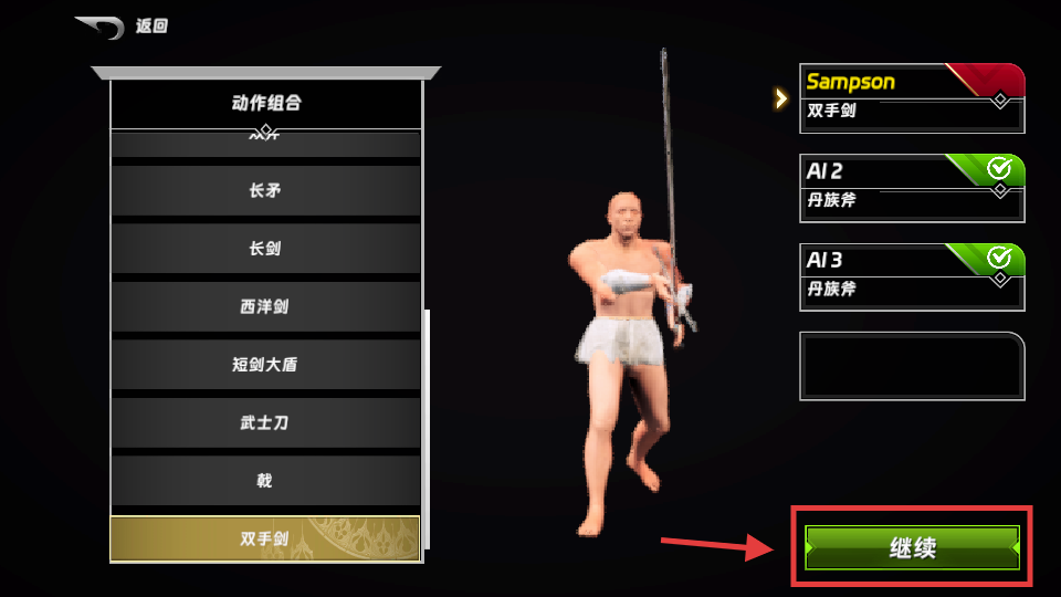 1、战斗前选择武器(如双手剑),选好后点击继续,即可进入角斗场开启对战。