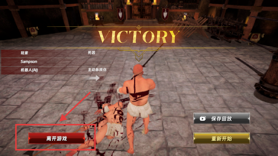 4、战斗胜利后,点击离开游戏可返回主界面,也可选择保存回放或重新开始。