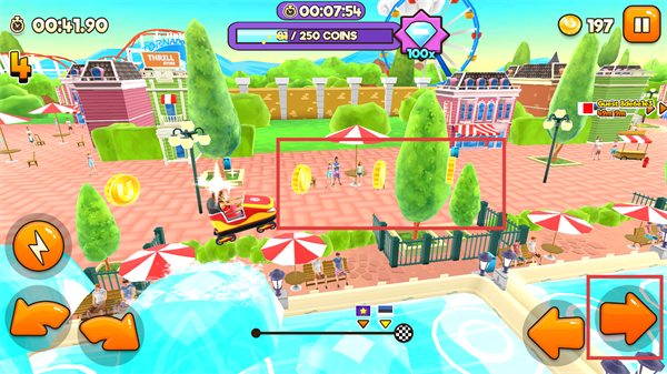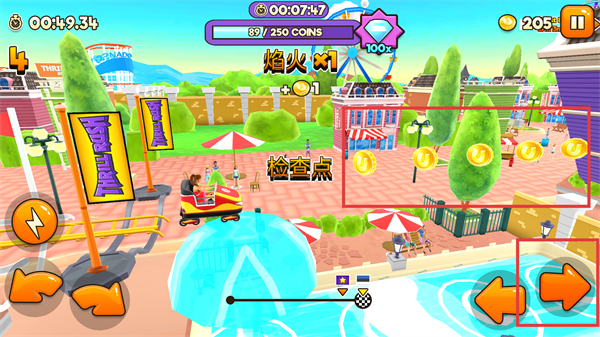 1、在游乐园场景中操控【红色小车】移动,通过左右方向键收集沿途【金币】,积累分数推进进程。