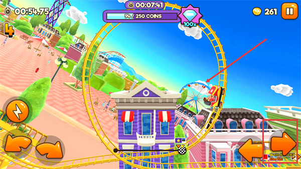 3、操控小车沿【环形过山车轨道】行驶,通过特技路段时保持平衡,借助轨道加速效果获取额外分数与奖励道具。