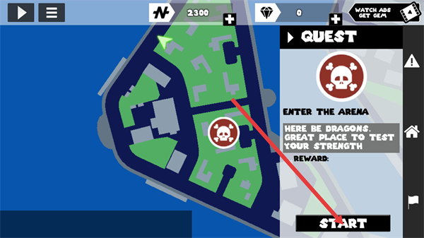 1、打开游戏进入主界面,找到带有骷髅标识的竞技场选项,点击下方START按钮进入。