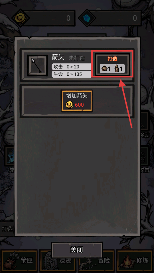 2、点击“打造”按钮,消耗对应材料打造箭矢,可大幅提升箭支的攻击和生命属性。