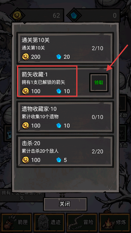 3、完成“箭矢收藏·1”成就后,点击“领取”获取金币与蓝晶,用于后续强化箭矢。