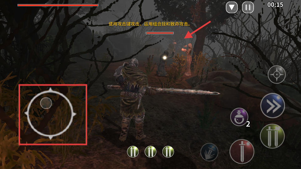 2、左侧摇杆控制移动,按攻击键或组合技攻击敌人,初期需熟悉操作,应对弱怪积累经验。